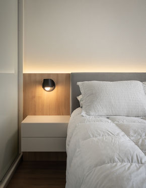Na suíte, as mudanças sutis, como a marcenaria, a pintura e o projeto luminotécnico, transformaram o ambiente em um refúgio leve, acolhedor e em perfeita sintonia com o novo banheiro.