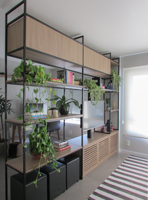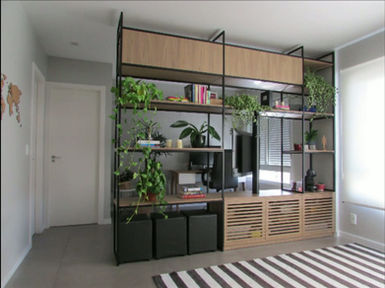 O destaque do projeto é a estante vazada com TV giratória, que organiza o espaço sem bloquear a circulação e permite o uso da tela em diferentes direções. Cada detalhe foi pensado para equilibrar funcionalidade e estética, do layout versátil ao mobiliário sob medida — criando um apartamento leve, prático e ideal para receber amigos.